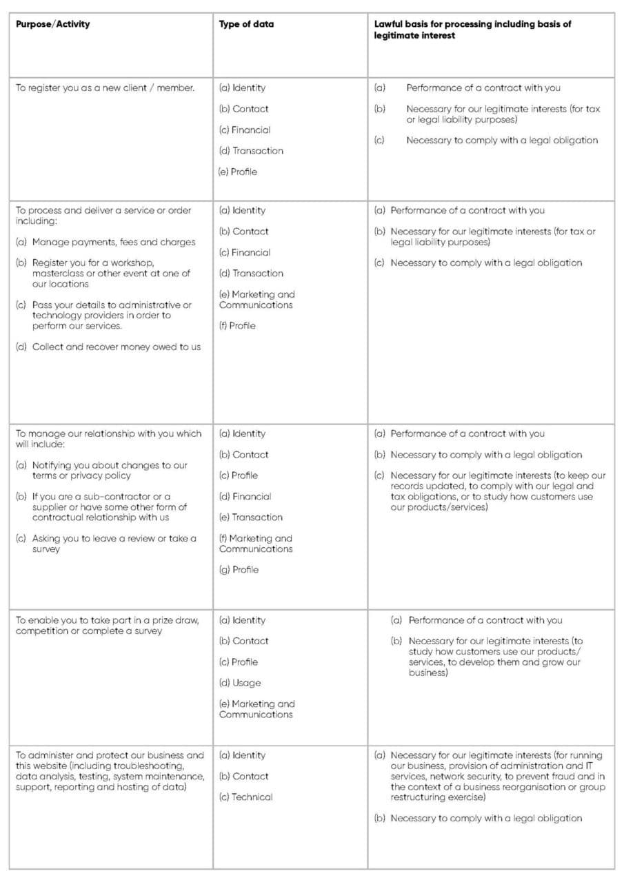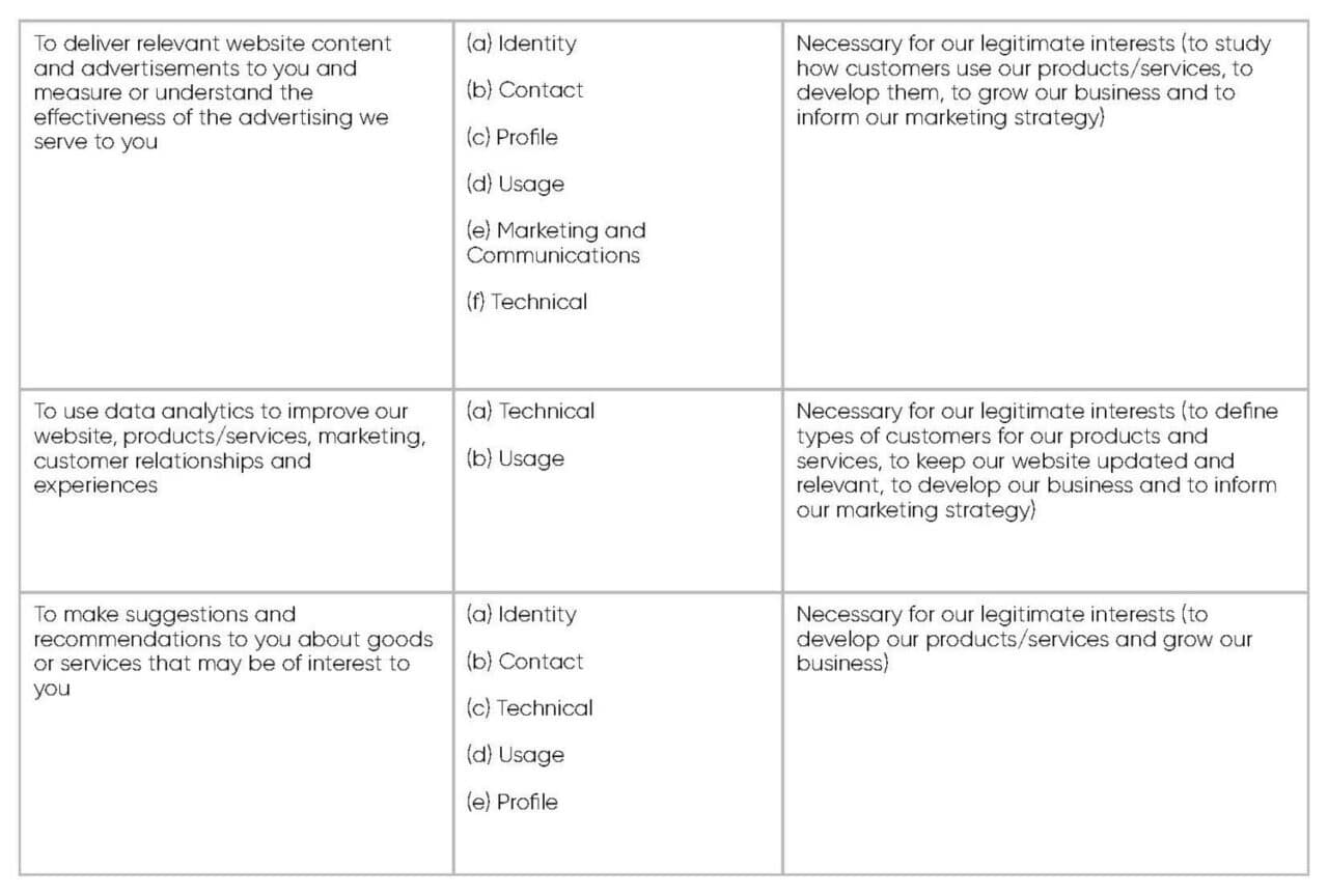 We have set out below, in a table format, a description of the ways we plan to use your personal data, and which of the legal bases we rely on to do so. We have also identified what our legitimate interests are where appropriate.